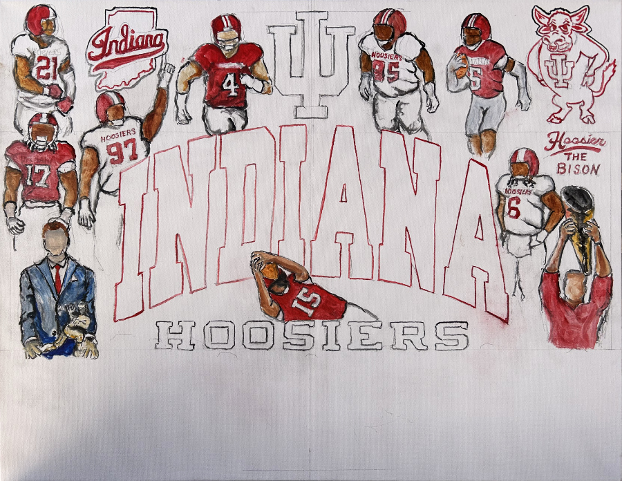 Tom has started work on another championship team tribute painting for his collection, a tribute to the NCAA College Football Champions, Indiana Hoosiers football team. In 2025, the Hoosiers achieved their second-ever undefeated regular season and won their first national championship in program history.